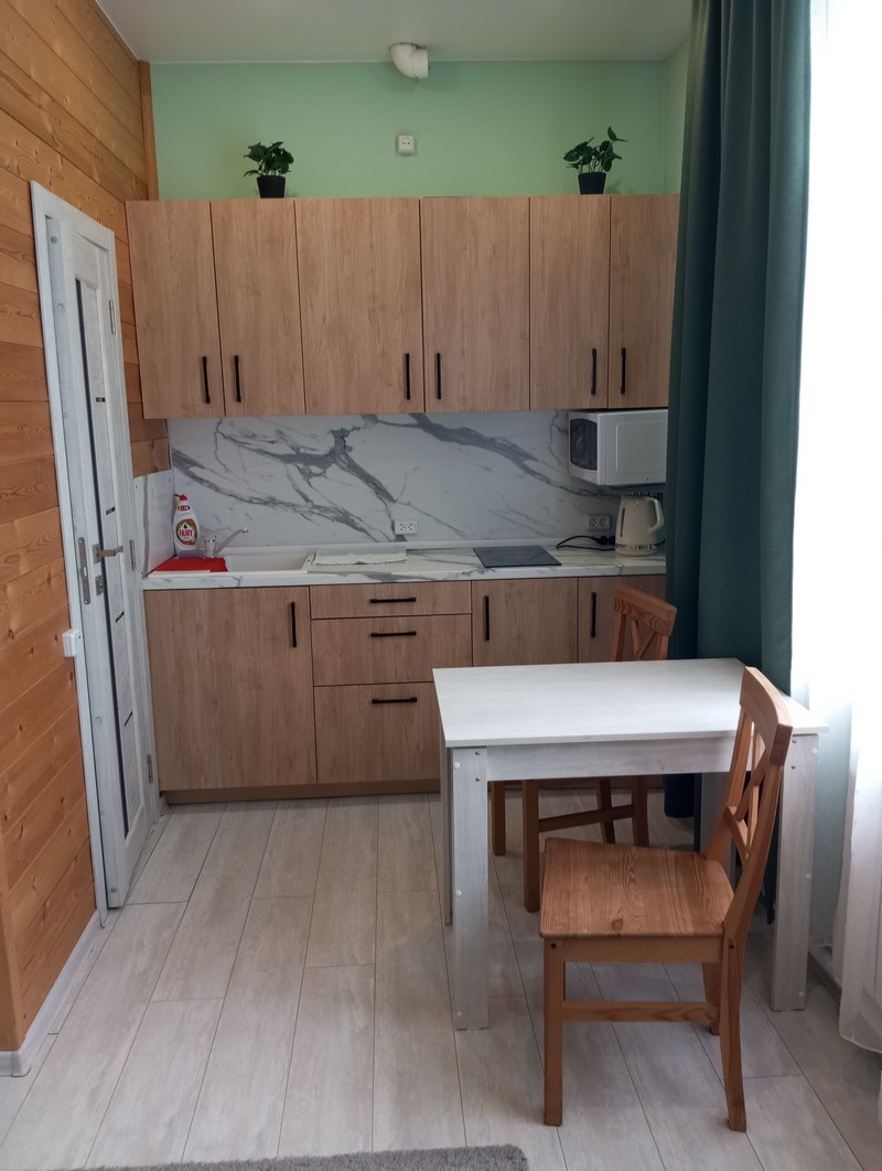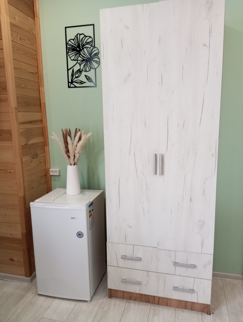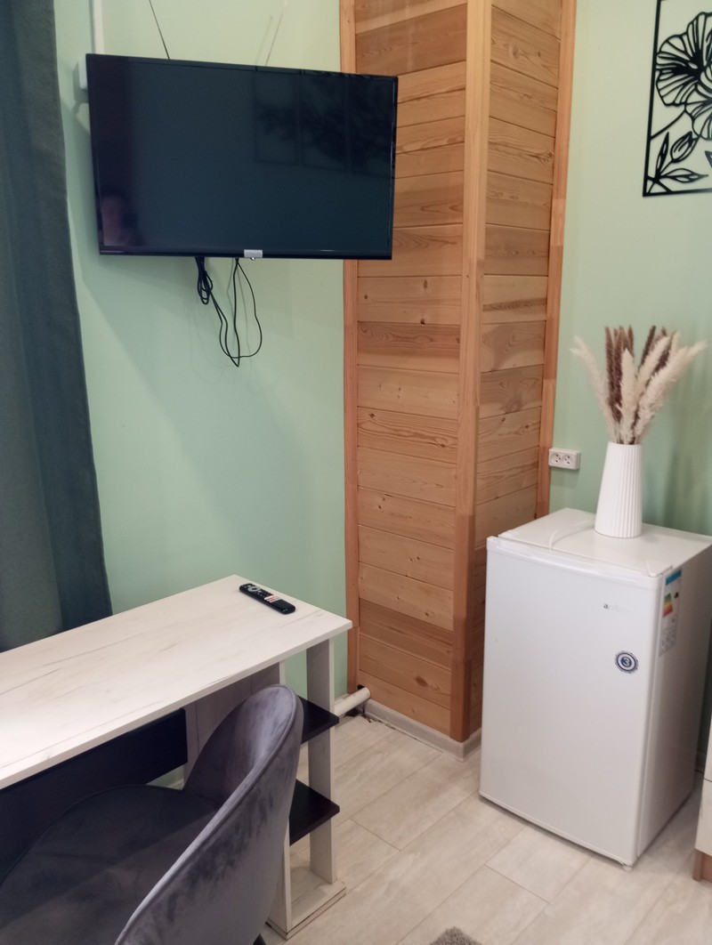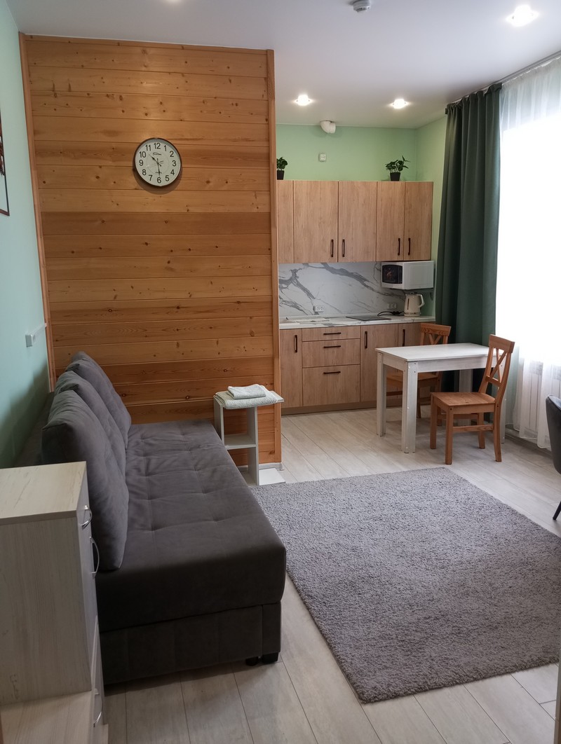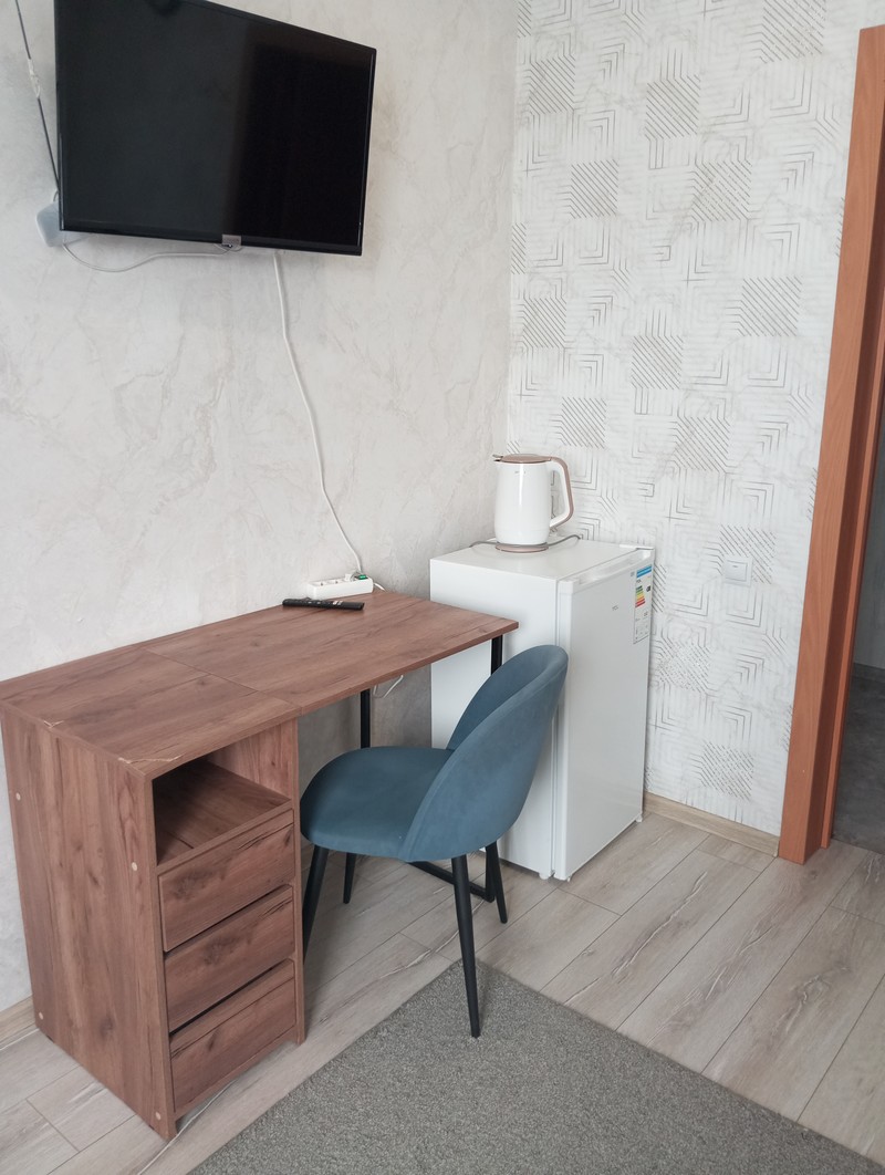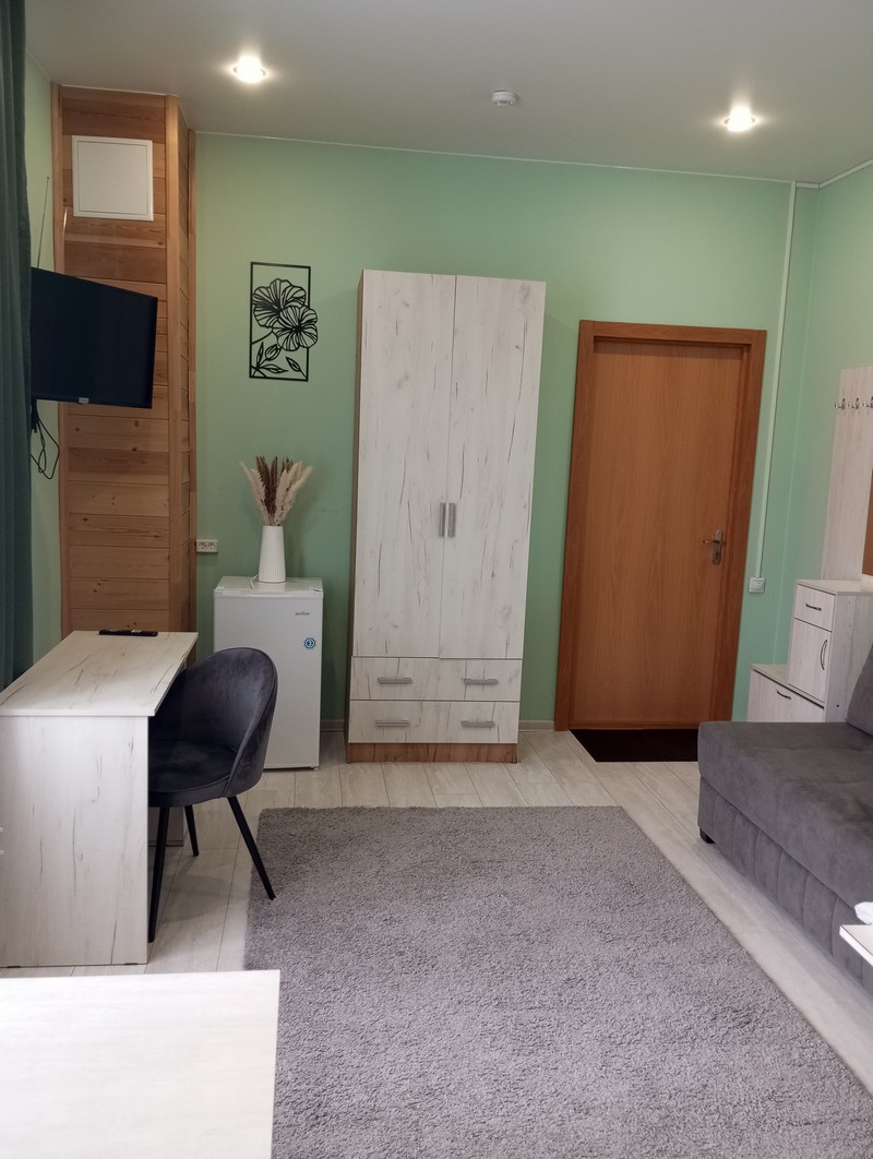 Номер состоит из двух комнат и санузла. В одной установлена двухспальная кровать, другая является кухней. В номере имеется телевизор, холодильник, микроволновая печь, и чайник.