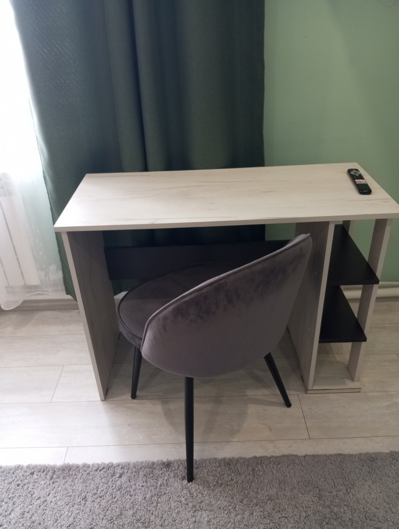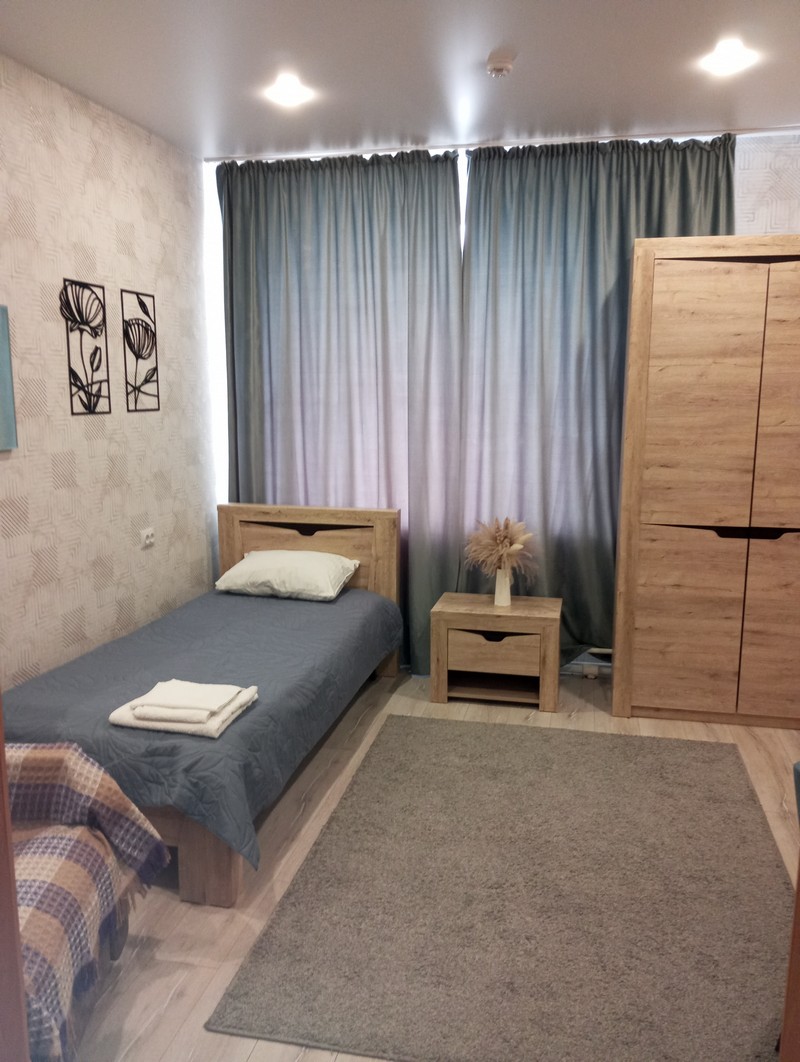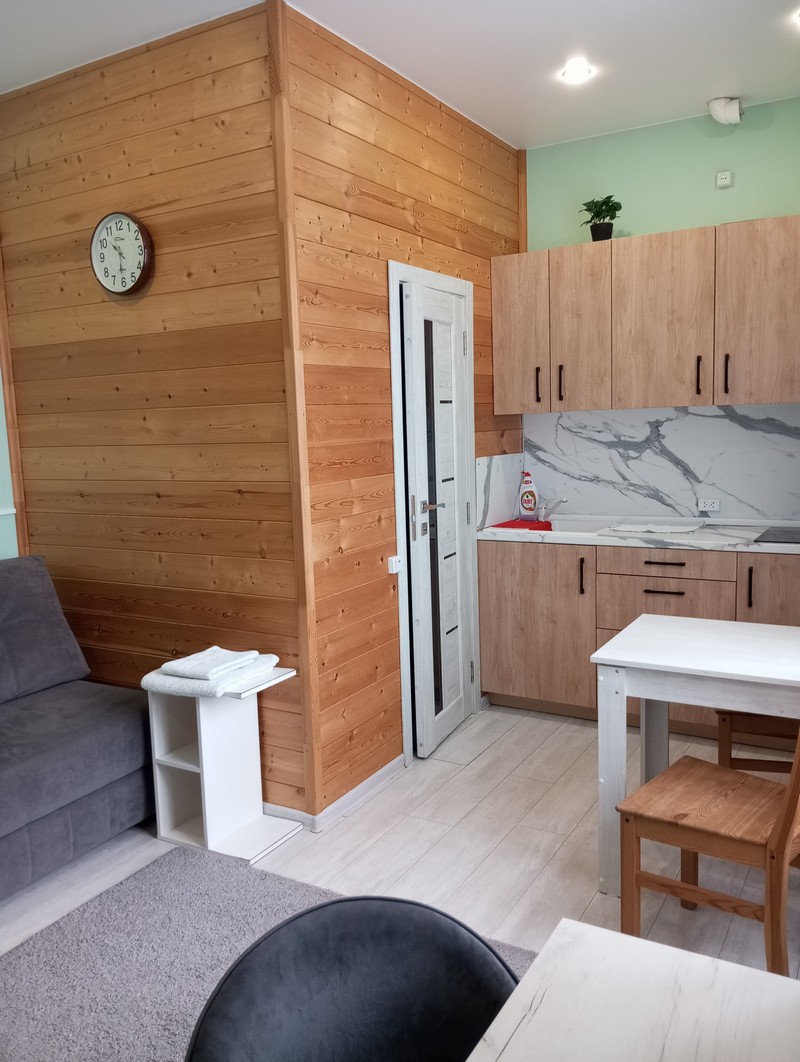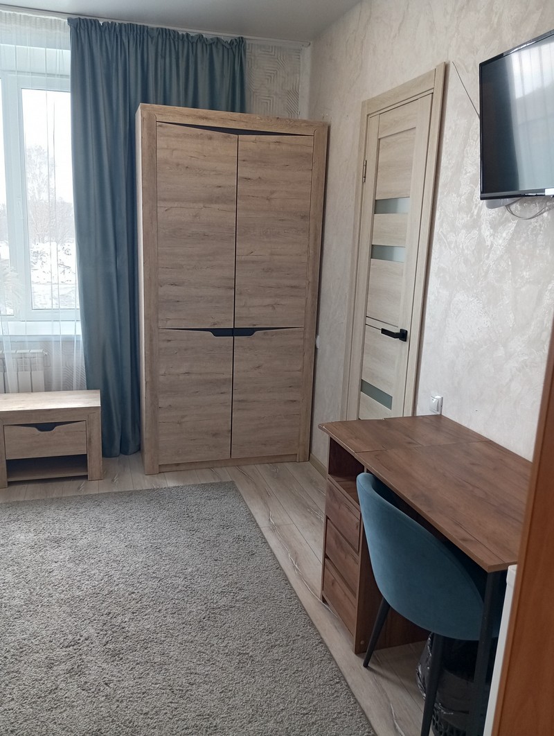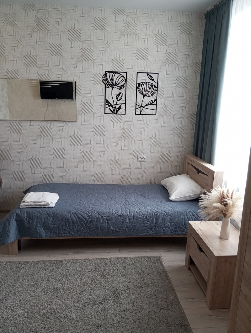 Номер состоит из двух комнат и санузла. В одной установлена двухспальная кровать, другая является кухней. В номере имеется телевизор, холодильник, микроволновая печь, и чайник.