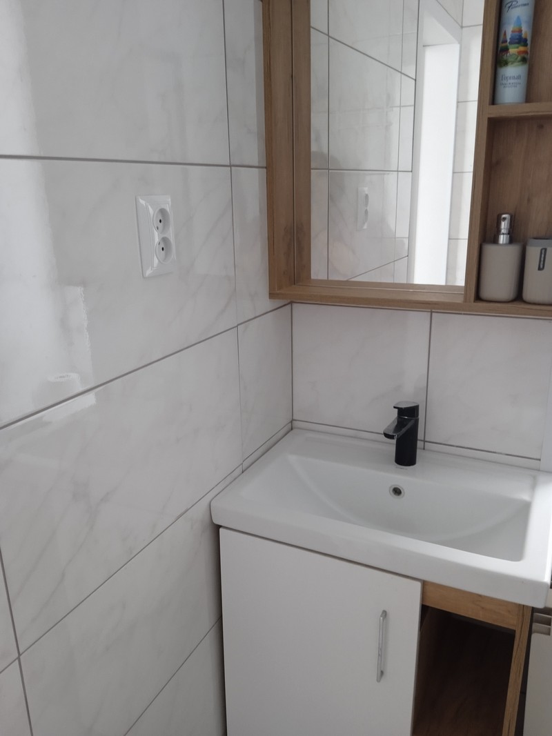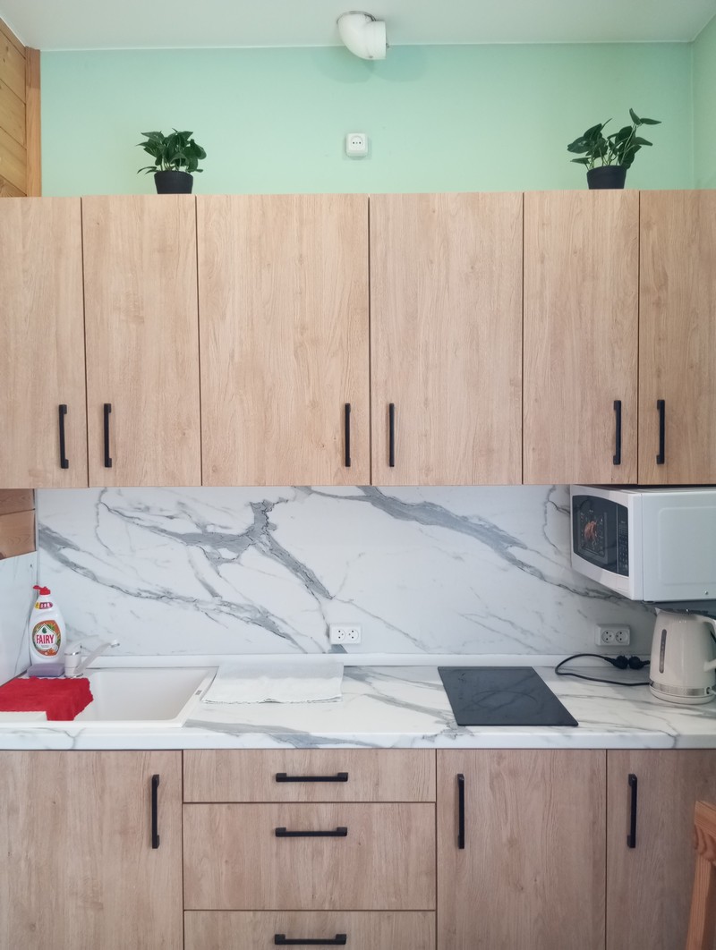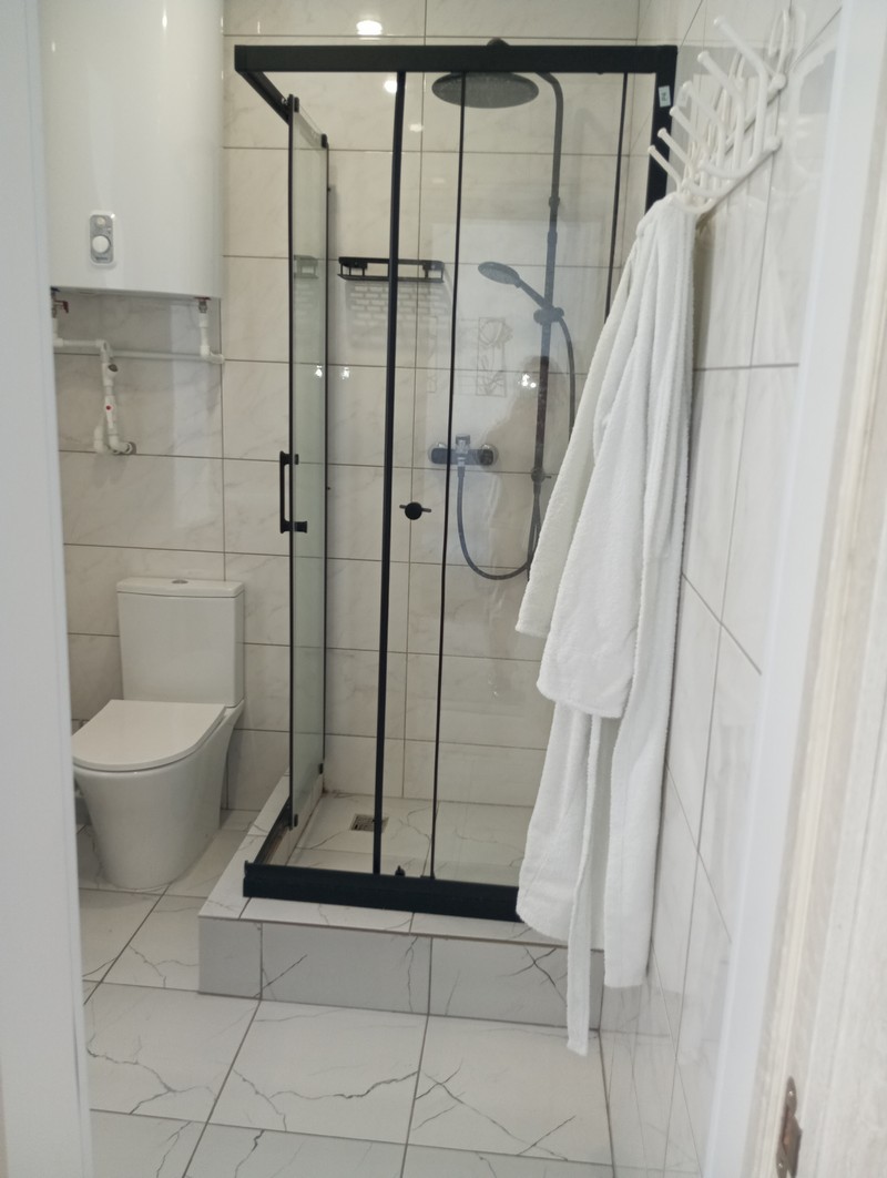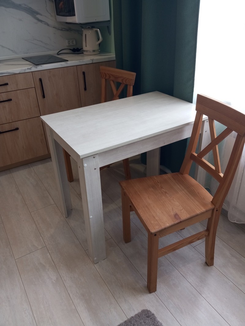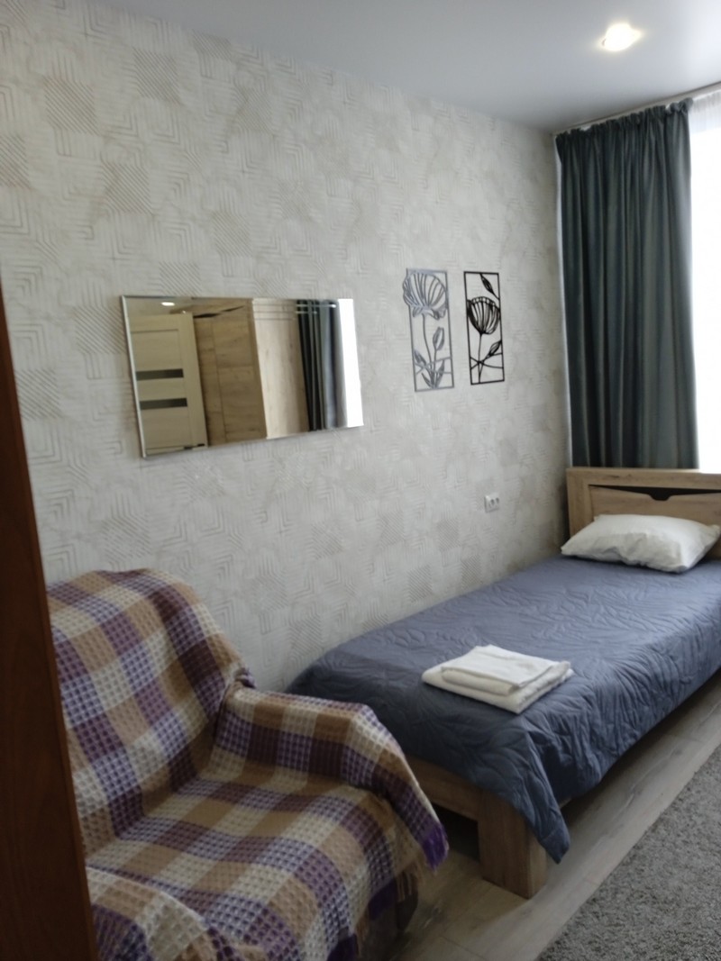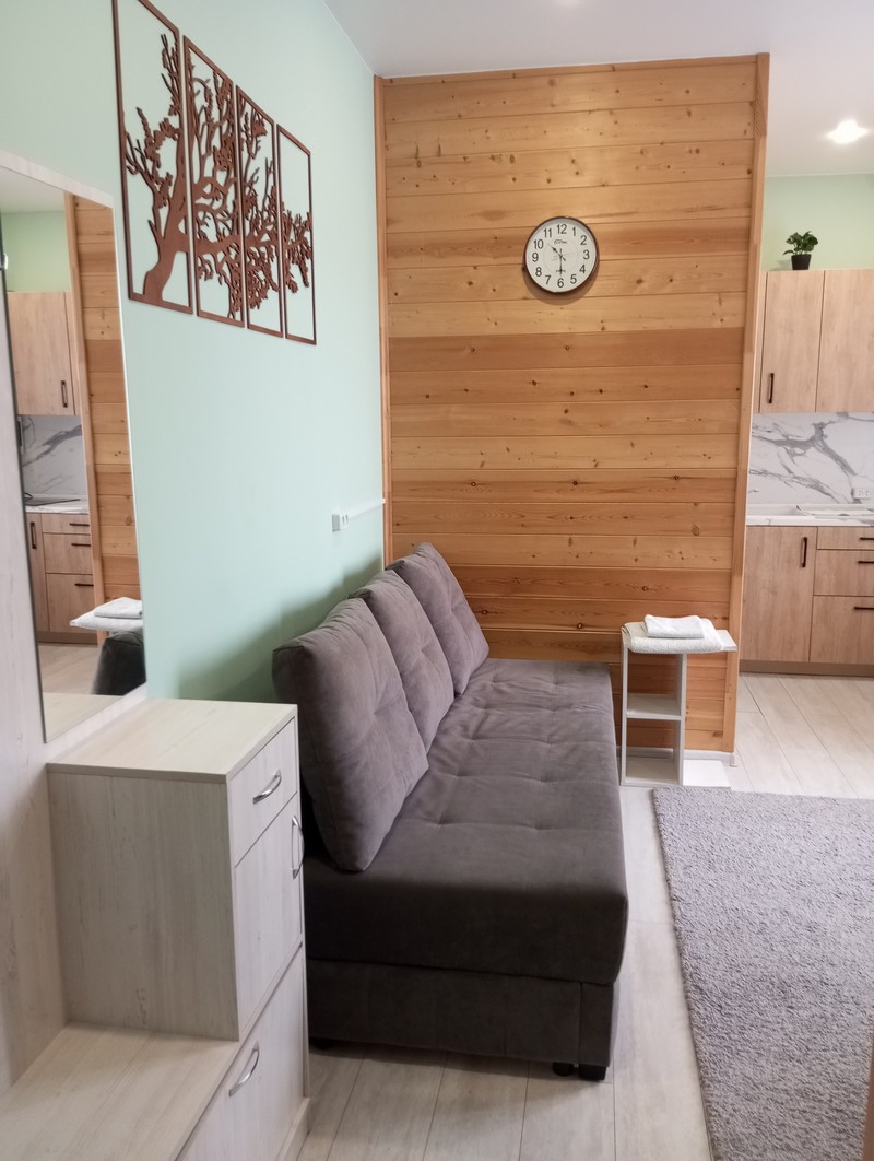 Номер состоит из двух комнат и санузла. В одной установлена двухспальная кровать, другая является кухней. В номере имеется телевизор, холодильник, микроволновая печь, и чайник.